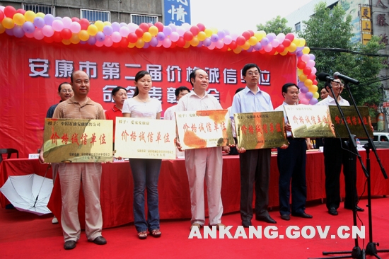 5月30日,安康市第二届价格诚信单位命名表彰大会在邮政广场举行,来自全市通信、医院、商场、酒店、药店等行业的19单位和企事业单位获此殊荣。会上,价格诚信单位代表向全市发出倡议:打造诚信的价格、规范的行为、优质的服务,全力构建诚信和谐安康。