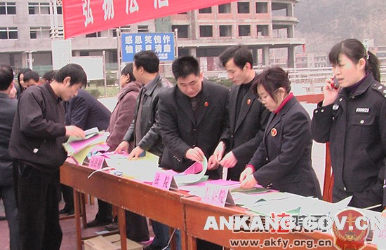 12月4日,是现行宪法公布实施25周年,也是中国第七个“法制宣传日”,“弘扬法治精神,推进依法治国”为2007年全国法制宣传日主题,在党的十七大胜利召开后的第一个全国法制宣传日来临之际,安康两级法院抽调业务骨干,积极开展主题为“弘扬法治精神,推进依法治国”的法制宣传和法律咨询活动。
