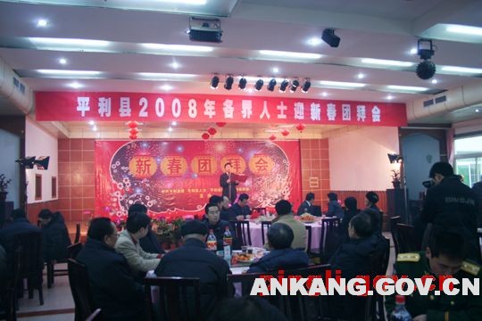 1月25日上午,平利县举行2008年各界人士迎新春团拜会。全体县级领导、外资企业界代表、民营企业主、个体工商户代表、农民企业家代表、外出创业者代表、科技界、教育界、文化艺术界、新闻出版界、知识分子代表、少数民族、宗教界、民主爱国人士、三胞亲属代表、驻军代表、省级以上劳动模范、离退休老干部代表、在外地工作回乡省亲代表等各界人士共160余人欢聚一堂,辞旧迎新,共贺新年。