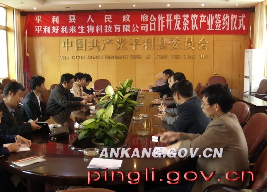 2008年11月7日,平利县政府与好利来生物科技有限责任公司举行了合作开发茶饮产业签约仪式。仪式由县委常委、县委办主任李平主持,副县长鲁延柱代表县政府与好利来生物科技有限责任公司进行了签约,县工会主席李宗高介绍了招商情况。