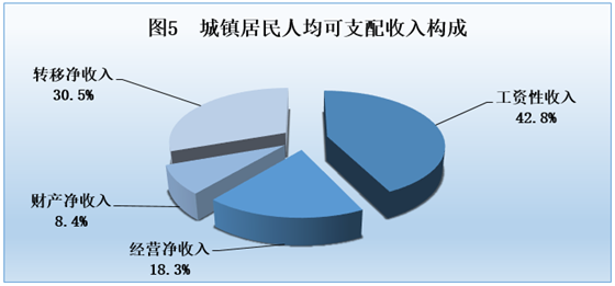 据城乡一体化住户调查,全年全市居民人均可支配收入17346元,比上年增加1512元,增长9.5%。其中:工资性收入7248元,增长9.4%,占可支配收入的比重为41.8%;经营净收入3325元,增长9.1%,占19.2%;财产净收入968元,增长9.7%,占5.6%;转移净收入5806元,增长10.0%,占33.4%。