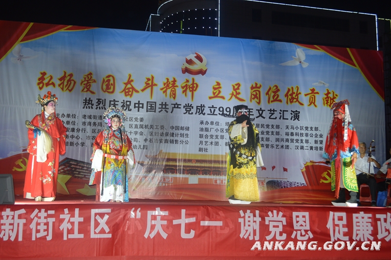 7月2日晚,培新街社区“庆七一 谢党恩 促廉政”戏曲专场文艺晚会在辖区鑫街口旅游商业广场举行。