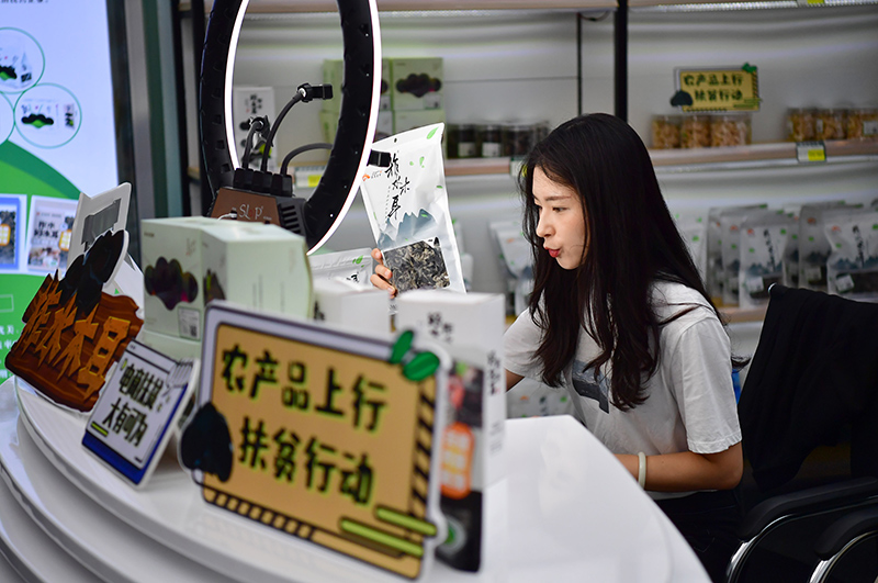 大厅一角,26岁的何锦漪正坐在手机前直播,一抹淡妆笑对直播间内的数百名“粉丝”。“我们每天可以销售三四百单木耳,常常供不应求。”她说,出外景时,她还会把金米村的绿水青山展示在“云端”。