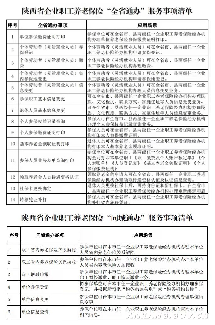 为深入开展人社服务快办行动,切实解决养老保险业务办理中的难点、堵点问题,不断增强服务对象办事体验,按照省社保局的统一安排部署,安康市处从10月8日起,在全市范围启动了企业职工养老保险业务通办工作,全市参保企业和群众可不分地域就近选择经办机构办理养老保险相关业务。