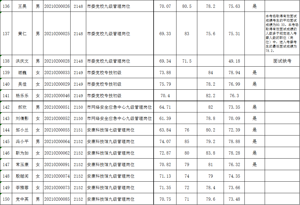 附件:2021年安康市市级机关和事业单位公开遴选工作人员进入面试考生笔试成绩、业务水平测试成绩、面试成绩、综合成绩和进入差额考察人员名单