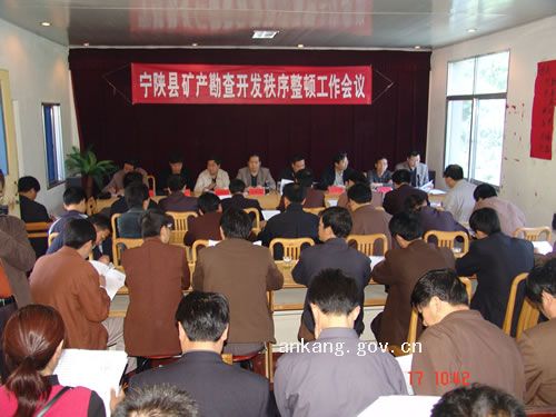 宁陕县矿产勘查开发秩序整顿工作会议于2005年5月17日上午在广货街镇召开。会议由县委副书记郭珉主持,县长陈伦宝、县委常委政法委书记刘彬志、县委常委宣传部长齐致祥、县人大常委会副主任彭世成、副县长周永鑫、县政协副主席廖佑麟出席会议,广货街、江口、旬阳坝、金川镇镇长,县国土局、公安局等单位主要负责同志,各矿产开发、勘查企业负责人参加会议,三秦都市报、陕西农民报、西部开发报等新闻媒体的记者应邀列席会议。