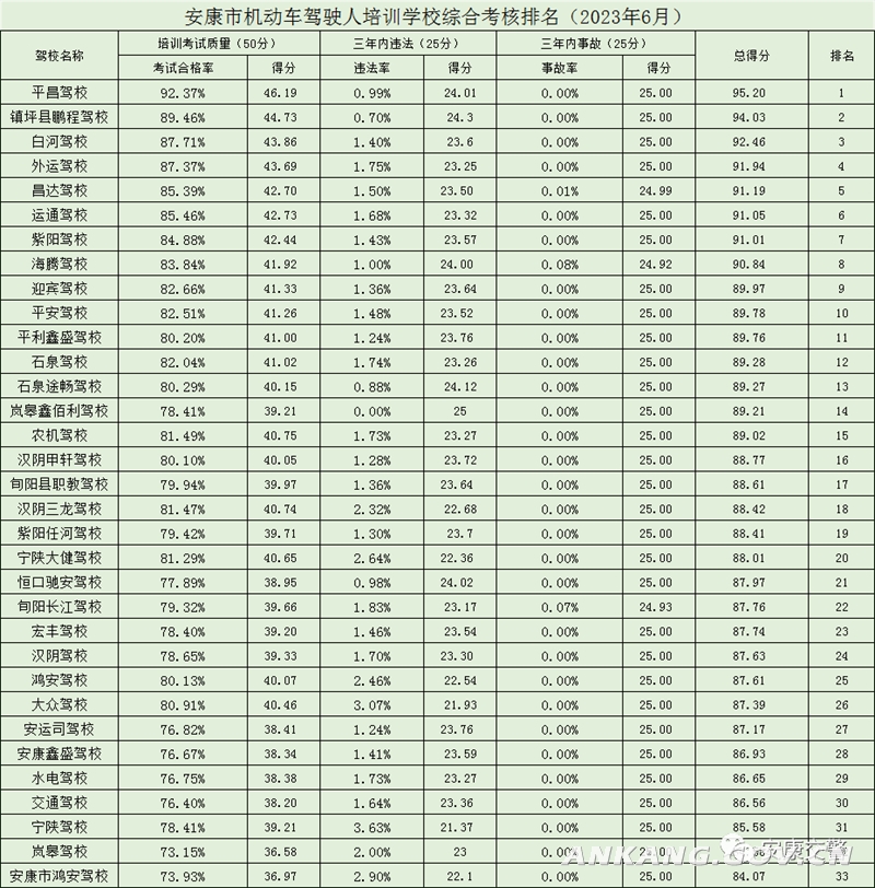 附件:1.安康市机动车驾驶人培训学校综合考核排名