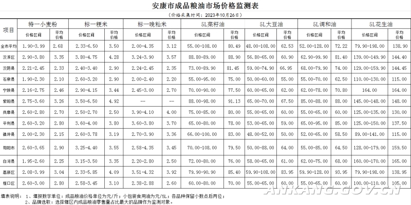 安康市粮油市场价格监测表(2023年10月26日)