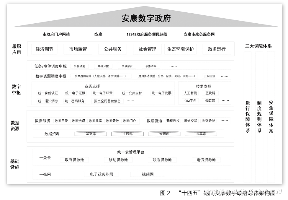 近年来全市数字政府建设取得了明显成效,形成集基础支撑、履职能力、运行保障体系一体的数字政府总体架构(见图2)。