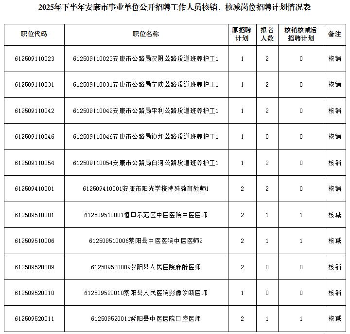根据《2025年下半年安康市事业单位公开招聘工作人员公告》(以下简称《公告》),本次招聘网上报名于2025年9月4日18:00时结束,考生缴费时间于9月5日24:00时截止。 经统计,共有8个岗位需核销招聘计划10个,3个岗位需核减招聘计划3个,现予以公告(见附表)。根据《公告》规定,对应聘岗位被核销的应聘人员,由相关部门办理退费手续。 附件:2025年下半年安康市事业单位公开招聘工作人员核销、核减招聘计划情况表