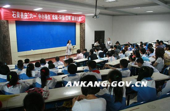 为庆祝国际“六一”儿童节,不断提高我县中小学生的文明素养和综合素质,展现新时期青少年保护环境、提升素质、奋发进取的精神风貌,进一步倡导“低碳”生活,带动全县人民增强环保意识、提升文明素质,在全县范围内营造一个“倡导低碳生活、提高文明素质、共享美好家园”的良好氛围。5月31日,由石泉县委宣传部、县妇联、环保局和教体局联合举办的“低碳、环保、文明”演讲比赛在我县青少年活动中心举行。