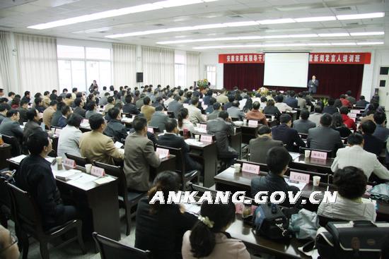 10月26日上午,全市提高领导干部应对媒体能力暨新闻发言人培训班在安康学院开班。方玮峰、崔光华、钟顺虎、何少华、马赟等市上领导出席并听取了讲座。市委中心学习组成员、各县区委宣传部长、各县区政府新闻发言人和新闻发言人助理;市政府各工作部门新闻发言人;中省驻安各单位新闻发言人或分管领导参加报告会。