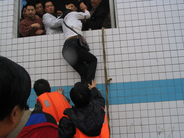 10月2日晚,第三次洪峰袭来,正在旬阳美华大酒店附近组织抗洪抢险的民警突然听到呼救声,县公安局副政委李朝信、赵奇峰立即组织民警前往营救。原来,在力源小区住宅楼下,一位老太太浸泡在水中,双手紧紧抓住楼壁的下水管道,情况十分危急。武警巩亮亮、马小明奋不顾身跳入水中,将民警王振良找来的绳索系在老人腰间,大家七手八脚将其救出,并转移到安全地带。