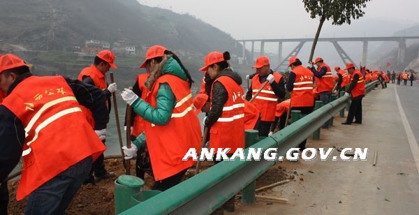 在瀛湖快速干道中段,近150多名公路干部职工挥镐铲土,植树造林,一派热火朝天场面。一批小叶女贞、香樟树立在公路两旁,成为一道靓丽的风景。