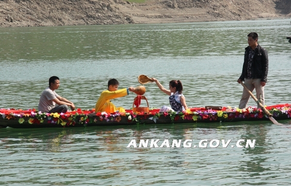 下午三时,取水仪式正式开始,两只装饰精美的小木船载着两队少男少女缓缓驶入湖心。伴随着悠扬的民歌《清溜溜的汉江水》在湖面唱响,我市选拔的4名年轻小伙儿和汉水姑娘开始慢慢舀起清粼粼的汉江水盛入木桶。此时的取水台上,早有站满了前来参加汉江取水的百余名党政领导和工人、农民、学生、教师代表,待取水船靠岸后,人们开始用手拉手的方式将盛水木桶接力传送到送水仪式现场。