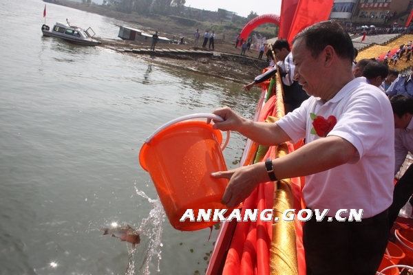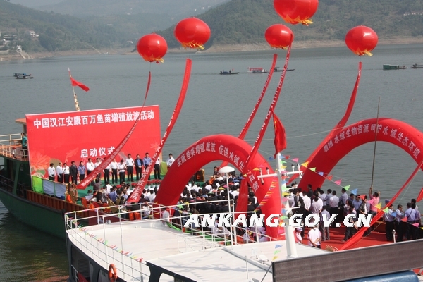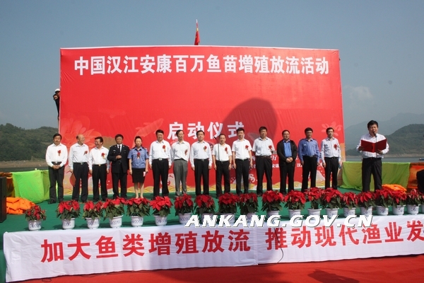 9月28日,市政府与省水利厅在汉滨区流水镇码头隆重举行“中国汉江安康百万鱼苗增殖放流活动启动仪式”。农业部长江渔业资源管理委员会主任宋志俊、市委书记方玮峰、市长郭青、副市长邹顺生出席启动仪式。省水利厅厅长王锋现场下达增殖放流启动命令。在阵阵锣鼓声中,出席仪式的领导纷纷提起水桶,与当地群众一起向瀛湖中投放鱼苗。