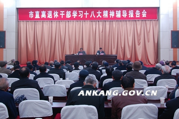 11月22日下午,安康市委老干部局组织举办了市直离退休干部学习党的十八大精神辅导报告会,市委组织部副部长、老干部局长聂长久主持报告会,市委讲师团副团长赵富振应邀辅导,副局长刘小杰出席报告会。