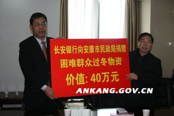 11月22日,长安银行安康分行向市民政局捐赠价值40万元的过冬物资,帮助汉滨、石泉困难群众温暖过冬。市委常委、副市长王安利出席捐赠仪式并讲话。