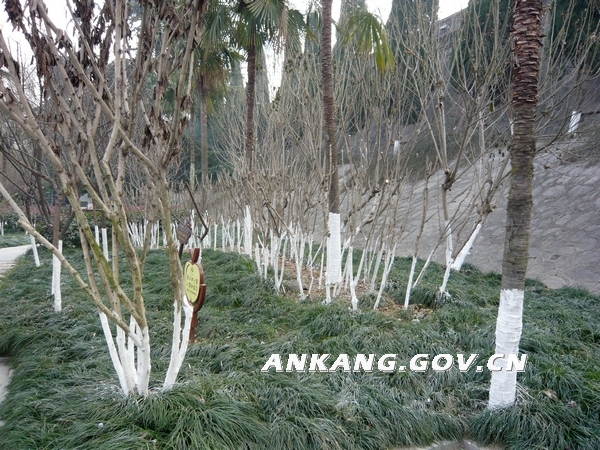 据悉,新一轮创园、创卫的强势推动,有力的推动绿化建设的步伐,安康大道南侧绿地、七里沟、沿江路、南山防洪渠等新一批亮点工程的逐步完工,截止2012年年末,使市绿化处所管辖绿化面积增至120万余平方米,为确保中心城区绿化建设成果,入冬以来,市绿化处养护班组投入2000余人次,车辆10台,对街头绿地、公园广场、道路附属绿等绿地的草层和地面进行清理,及时清理区域内所残留的垃圾、枯枝败叶等,营造干净整洁的环境。同时对所有行道树及乔木进行刷白,增强苗木抗寒抗病性,确保达到防冻和防治病虫害的目的。