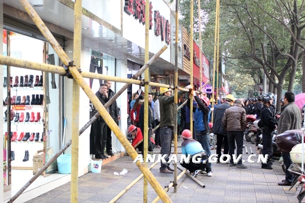 金州路作为安康江南城区核心位置,商业繁华,人口密集,且流动量大,为保证沿街公共资产腾退工作安全有序开展,市政府专门调集汉滨公安70余人警力、警车14辆开展治安维护工作。在金州路原市交通局楼下,对极少数恶意阻挠施工搭架的商户进行强行带离现场,做进一步处理。